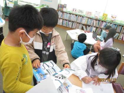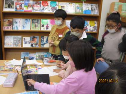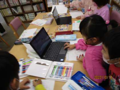 1年生 学習発表会に向けて2 公開日 2022/10/13 更新日 2022/10/13 1年生 学習発表会では、リズムに合った言葉をつなげてつくった短いお話を発表します。自分たちがつくったお話の内容を分かりやすく伝えるために、紙芝居をつくりました。意味が分からない言葉はクロムブックや図書室の本で調べました。