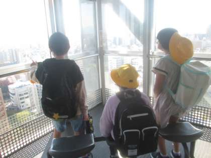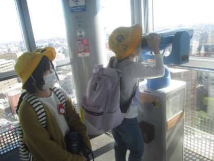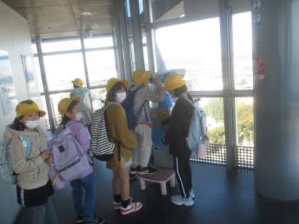 富山市役所展望塔に行きました。70メートルの高さから富山市を眺めました。高いところから普段住んでいる町を見渡して、気付いたことがたくさんありました。これからの社会科の学習に生かしていきます。