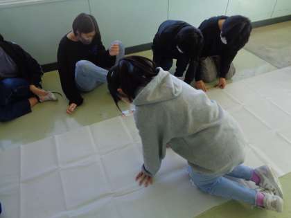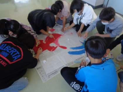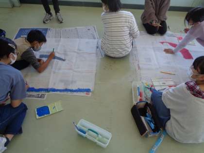 学習発表会で使う旗を描いています。みんなで協力して色を塗りました。