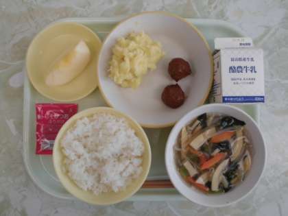 10月14日の給食 公開日 2022/10/15 更新日 2022/10/15 メール用カテゴリ 今日の給食は ごはん ぎゅうにゅう ミートボール チーズおさつ はるさめスープ りんご しそかつおふりかけ です。 具だくさんのはるさめスープと、チーズとさつまいもの味のバランスのいいチーズおさつ。 今日もおいしくいただきました。