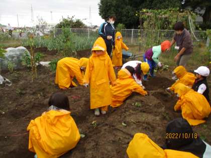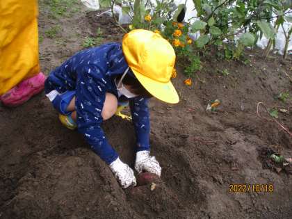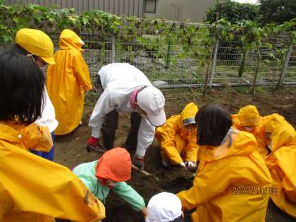 1年生 生活科 さつまいもの収穫 2 公開日 2022/10/21 更新日 2022/10/21 1年生 芋を傷付けてしまわないように、丁寧に土を掘りました。土の中からきれいな紫色の芋がチラリと顔を出しているのを見付ける度に、歓声があがりました。大きな芋はみんなで力を合わせて掘りました。地面が固くてなかなか掘れないときには、地域の方が手伝ってくださいました。
