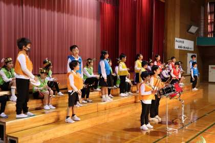 2年生の「リズム&ハーモニー心をあわせて」では、みんなでリズム奏をしました。また、3年生と声を合わせて「太陽のサンバ」を歌いました。「太陽のサンバ」では、振り付けを加えて、区域連合音楽会からパワーアップした姿が見られました。