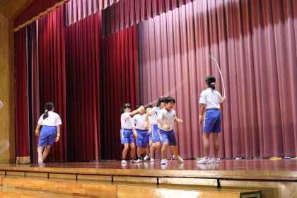 4年生の「みんなのしあわせダンス」では、振り付けや移動の仕方など、みんなで話し合いながら取り組んできました。短縄や大縄を使った演技、そろったダンスが見られました。