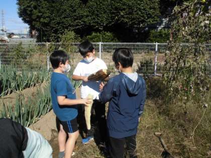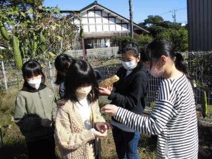 晴天の下、ヘチマの様子を観察に行きました。茶色く枯れたヘチマがいくつかありました。茶色くなった皮を取りました。ヘチマを振ると中からヘチマの種もたくさん取れました。