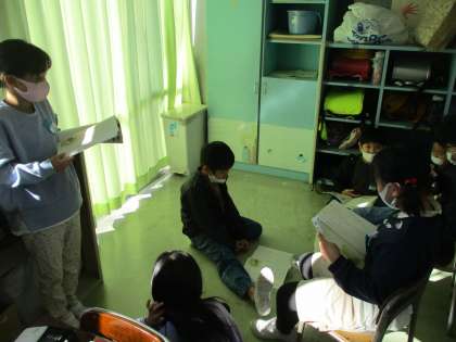 国語科の学習より 公開日 2022/10/27 更新日 2022/10/27 2年生 「お手紙」の学習のまとめとして、2グループに分かれて音読劇をしようと練習をしています。みんなで話し合って、がまくんやかえるくんの動きや、読み方の強弱を付けて楽しんでいます。