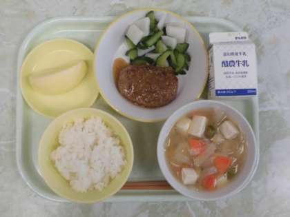 11月1日の給食 公開日 2022/11/01 更新日 2022/11/01 メール用カテゴリ 今日の給食は ごはん 牛乳 和風煮込みハンバーグ きざみ和え 豆腐のみそ汁 りんご です。 今日もおいしくいただきました。