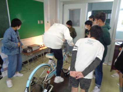 手回し発電機や、自転車での発電等、様々な方法で発電しました。苦労して発電してみて、普段何気なく使っている電気のありがたみが分かってきました。