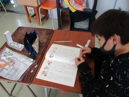 かがやき級 図画工作科「馬のおもちゃ」 公開日 2022/11/23 更新日 2022/11/23 かがやき級 国語科「馬のおもちゃの作り方」を読みながら、工作しました。説明文を読み、作る順序を理解して作ることができました。