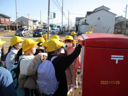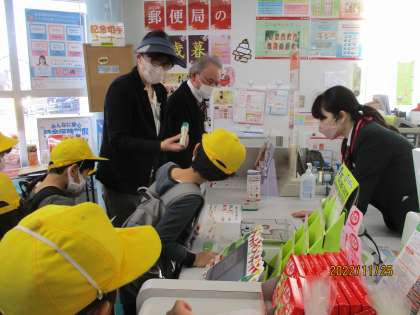 草島郵便局では、はがきを出してから送り主に届くまでの仕事内容を教えていただきました。また、プーさんの年賀はがきに隠れているプーさんの数クイズもあり、子供たちは「隠れプーさんがいるんだ!」「1つじゃないんだね」と大盛り上がりでした。