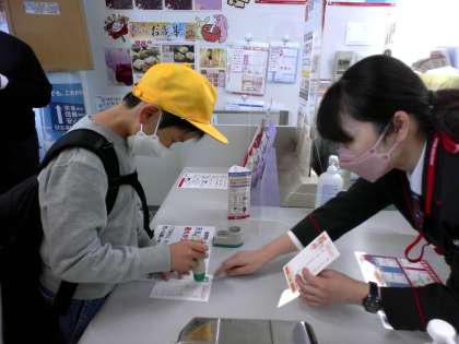 事前に、家族や離れて暮らしている祖父母、いとこ、友達など、送りたい相手を決めてから学校で書いたはがきに、押印をする仕事も特別に体験させていただき、子供たちはとてもうれしそうでした。