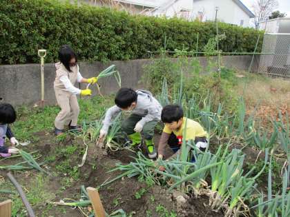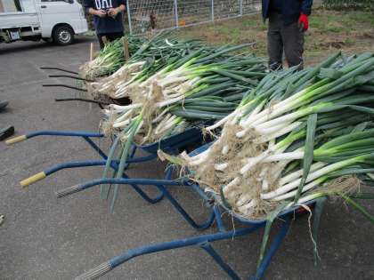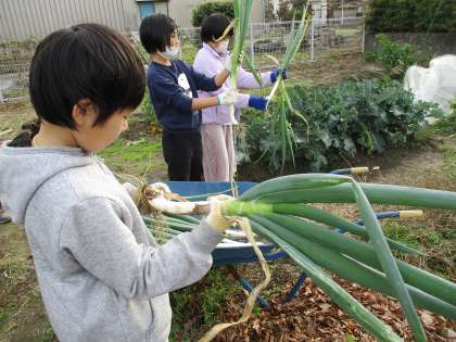 青々とした立派なねぎに育ち、子供たちは足を踏ん張って引き抜いていました。畑いっぱいにねぎのよい香りが漂い、「おいしそうだね」と話していました。