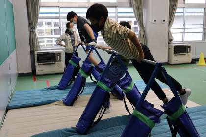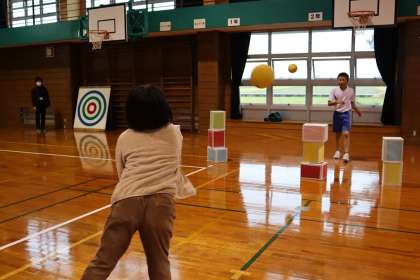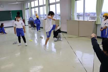 子供たちにとって、「ゴム跳び」はあまり馴染みのない運動でしたが、縦割り班の友達と、楽しそうに取り組んでいました。