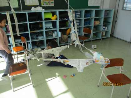 2年生 図画工作科の学習より1 公開日 2022/12/09 更新日 2022/12/09 2年生 「つないで、つるして」の学習では、細長く切った新聞紙をつないだり、吊したりしてできる世界を楽しみました。 友達と長くつなげたり、形をつくったりして、少しずつ世界を広げていきました。
