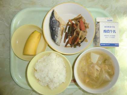 12月9日の給食 公開日 2022/12/09 更新日 2022/12/09 メール用カテゴリ 今日の給食は ごはん ぎゅうにゅう さわらのしおやき くきわかめのきんぴら ぐだくさんじる バナナ です。 今日もおいしくいただきました。