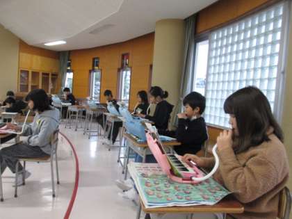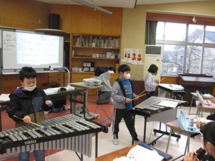 鍵盤ハーモニカと鉄琴で演奏します。 楽譜を確かめながら練習しました。