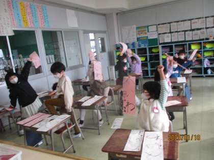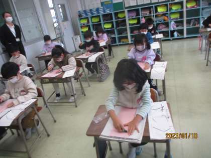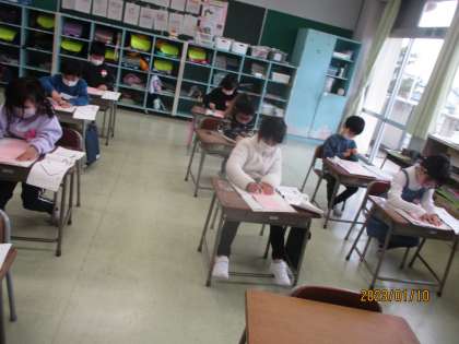 1年生 書き初め大会 公開日 2023/01/11 更新日 2023/01/11 1年生 初めての書き初め大会を行いました。1年生は硬筆墨で「へいわ」と力強く書きました。いつも鉛筆で書く字と違って、のびのびと大きく、力強く書きました。「さあ、がんばるぞ」という新年の新しい気持ちが伝わってきました。