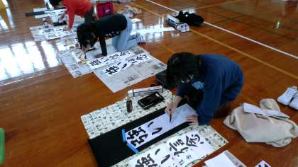 始業式後は書初大会でした。「強い信念」を力強く書いていました。