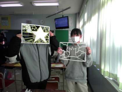 6年生 図画工作科 「ステンシル版画」 公開日 2023/01/12 更新日 2023/01/12 6年生 今日はカッターを使って、ステンシル版画の版を作りました。切り離さないように、細かい部分も慎重に切っていました。