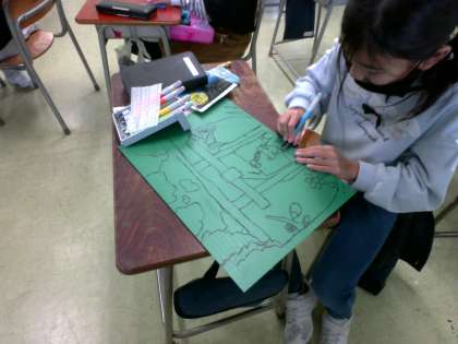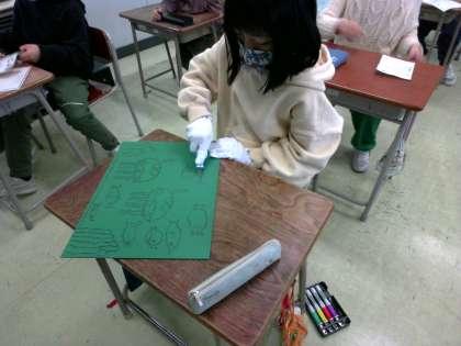 3年生 図画工作科「ゴム版画」 公開日 2023/01/16 更新日 2023/01/16 3年生 今日は、彫刻刀を使い、掘る作業を進めました。安全に気を付けて彫刻刀を使うことができました。その後、インクを塗って刷ることができました。 次回は、パステルを使い色鮮やかに装飾していきます。