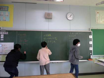 6年生 ワイドなかよしタイム 公開日 2023/01/18 更新日 2023/01/18 6年生 今日は、学級で黒板ゲームをしました。号車対抗で、曲名とキャラクター名の数を競いながら、とても盛り上がっていました。