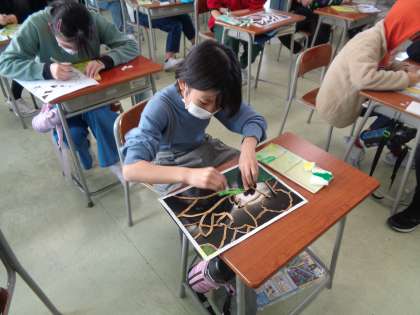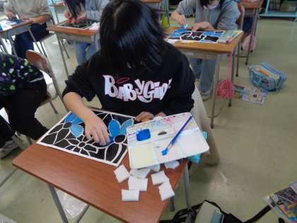6年生 図工 ステンシル版画 公開日 2023/01/19 更新日 2023/01/19 6年生 カッターで切り抜いた部分に、スポンジを使って色付けしています。水を使わないので、あえて混ざりきっていない色も楽しむことができました。
