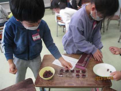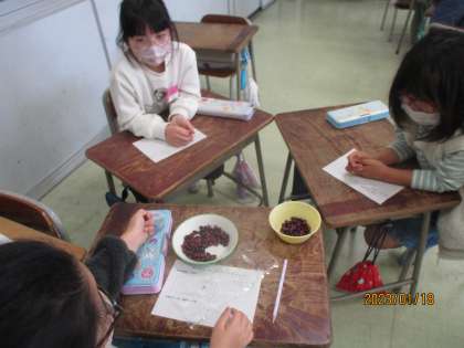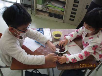 1年生 算数科「大きな数を数えよう」 公開日 2023/01/25 更新日 2023/01/25 1年生 40を超える数の豆を工夫して数える学習をしました。これまでの学習を生かして、10のまとまりをつくって数える方法で数えると簡単で正しく数えられるということにすぐに気が付きました。この後、豆のつかみ取りをし、卵パックに豆を10個ずつ入れながらとれた数を調べました。
