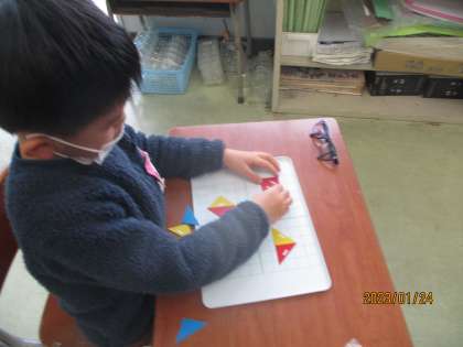 1年生 算数科「かたちづくり」 公開日 2023/01/26 更新日 2023/01/26 1年生 「かたちづくり」をしました。今日の課題は、「色板2枚だけを使って、いろいろな形をつくろう」です。直角二等辺三角形の色板を2枚並べ、大きな三角や四角等をつくりました。「あっ、三角だったのに四角ができた」「三角が大きくなった」「ちょっと回すと、これとこれは同じ形だ」などと、たくさんの発見をすることができました。