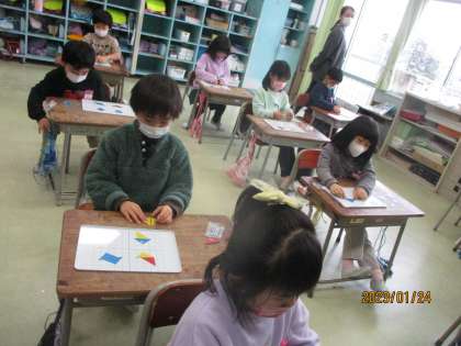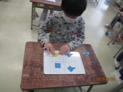 1年生 算数科「かたちづくり」 公開日 2023/01/26 更新日 2023/01/26 1年生 「かたちづくり」をしました。今日の課題は、「色板2枚だけを使って、いろいろな形をつくろう」です。直角二等辺三角形の色板を2枚並べ、大きな三角や四角等をつくりました。「あっ、三角だったのに四角ができた」「三角が大きくなった」「ちょっと回すと、これとこれは同じ形だ」などと、たくさんの発見をすることができました。