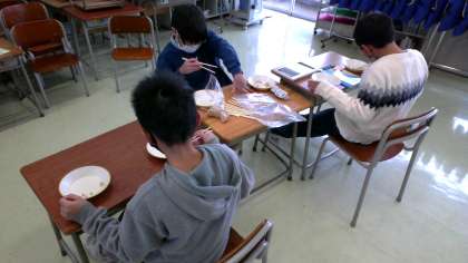 給食集会で行われる「はし名人王決定戦」に向けて代表3名が熱心に練習しました。