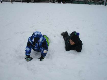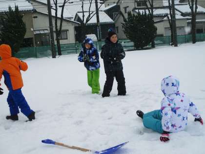 みんなで雪あそびをしました。グラウンドにたくさんの雪が積もったので、ふかふかの雪の上で寝転んだり、雪だるまを作ったりしました。とても楽しく遊びました。