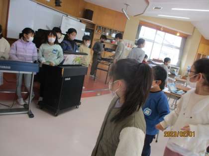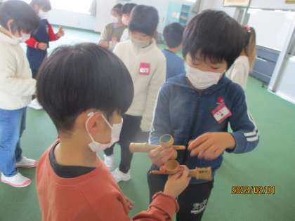 1年生 年長児との交流会 4 公開日 2023/02/02 更新日 2023/02/02 1年生 手を取ってけん玉の持ち方を教えたり、パズルのヒントを増やしたりして、できるだけ年長児たちが分かるようにと教え方を考え、関われるようになってきました。学習体験の後は、学校の中を案内しました。最後に、プレゼントのメダルを首にかけてあげて、年長児たちとお別れをしました。みんなで手を振って見送りました。もうすぐ2年生になる1年生たち、とても頼もしい姿をたくさん見せてくれました。