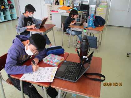 ちらし作りでは、クロムブックか、画用紙で作るかを自分で選んで取り組みました。
