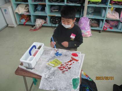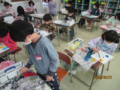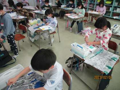 1年生 図画工作科「紙販画」3 公開日 2023/02/04 更新日 2023/02/04 1年生 紙版画の最後の仕上げをしました。黒いインクで印刷した版画の裏から、水彩絵の具で着色しました。インクが付いていない白い部分に絵の具の色を入れると、明るく華やかな雰囲気になりました。それから、作品に合う色の色画用紙を選び、台紙に貼って完成です。こんなに多くの工程を経てつくる版画は大変でしたが、子供たちは「楽しかった」と、大満足でした。