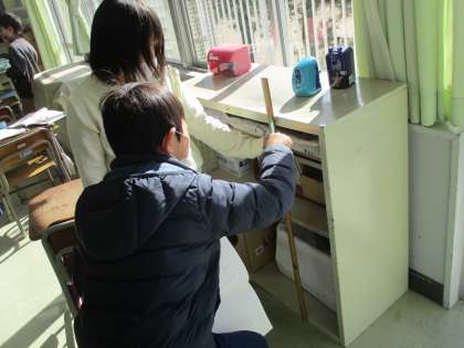 今日の算数科の学習では、自分の身体で1mの高さを予想したり、教室の中にある1mの長さ・幅のものを探したりする活動をしました。教室内の掃除用具ロッカーの幅がちょうど1mで、見付けた子供たちは「ぴったりだ!」と大喜びでした。