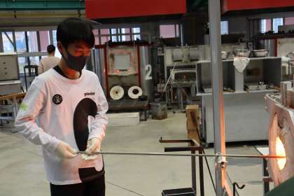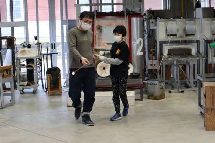 作家さんに手伝っていただきながら、炉からガラスを取り出したり、ガラスを溶かしています。