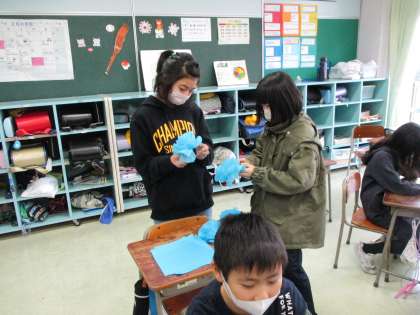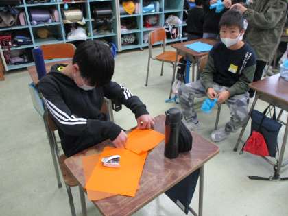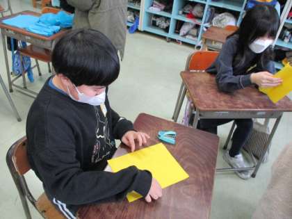 卒業式の掲示用の紙花作りをしました。子供たちは、慣れた手つきで、丁寧にお花紙を折って作っていました。