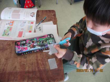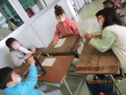 「ひろさをくらべよう」の学習では、まず一人で課題に挑戦し、自力解決をしたあと、グループで友達の考えを聞き合いました。各自が、ワークシートに数字を書き込んだり、形を切り抜いて重ね合わせたりしながら、広さの比べ方を考え、友達に説明しました。どちらが広いかを比べた結果は同じでも、その答えにたどり着くまでの解決の仕方は一人一人違います。「かんたんでいいね」「わかりやすい」という声があちらこちらから聞こえてきました。