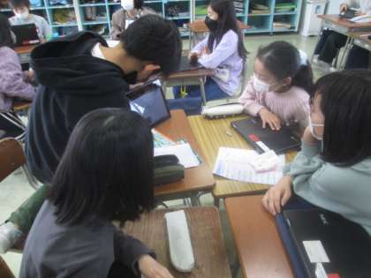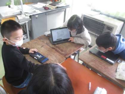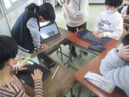 国語科の時間では、クロムブックを使い3年生で作った作品を紹介し合いました。相手が見えやすいように発表することや、友達の発表後には感想を言うことができました。