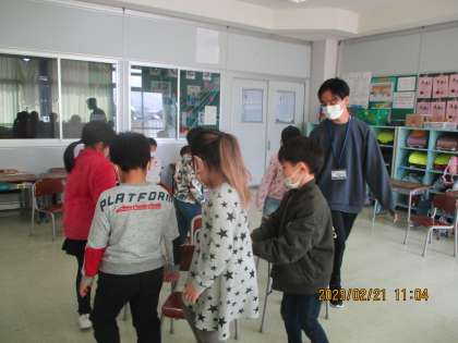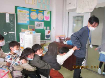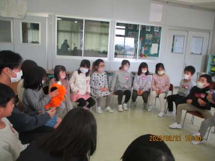 1年生 学びのアシストの先生とのお別れ会 公開日 2023/02/22 更新日 2023/02/22 1年生 学びのアシストとして授業の補助をしてくださった学生さんが来校する最後の日でした。一緒に遊んだり勉強を教えてもらったりしたことを思い出しながら、いすとりゲームや爆弾ゲーム、先生への質問タイムを楽しみ、別れを惜しみました。 最後はみんなで「ありがとうございました」と挨拶をしました。