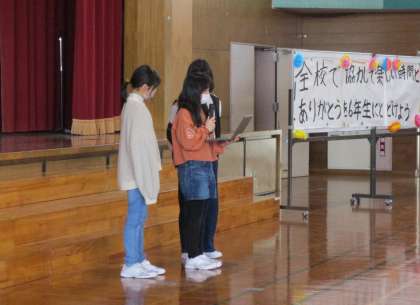 4年生 卒業を祝う会 公開日 2023/03/01 更新日 2023/03/01 4年生 卒業を祝う会では、4年生は‘ジェスチャー伝言ゲーム’で、6年生と対決しました。全校で楽しい時間を過ごすことができました。