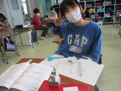 方眼紙で直方体や立方体の箱の形を作りました。子供たちは、縦、横、高さの長さを確認しながら、展開図を描き、箱を作っていました。