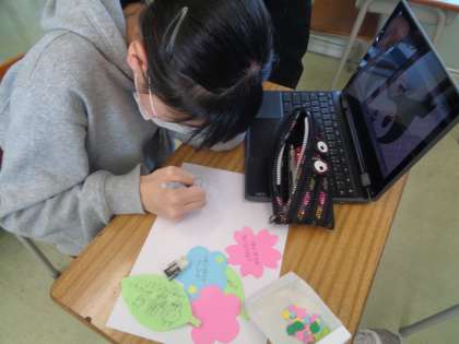 卒業まで残り9日です。とうとう登校する残りの日数が一桁になりました。今日は、在校生へ贈るしおりを作成しました。自分の班の子に向けて丁寧に作っています。