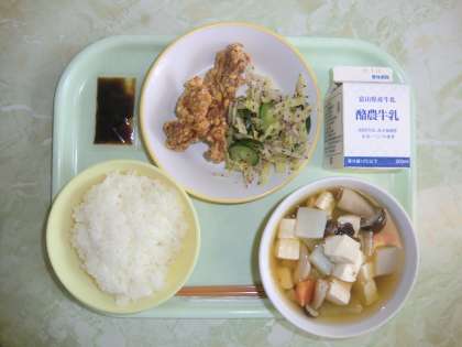 3月9日の給食 公開日 2023/03/09 更新日 2023/03/09 メール用カテゴリ 今日の給食は ごはん ぎゅうにゅう とりにくのたつたあげ ゆかりあえ けんちんじる のりつくだに です。 今日もおいしくいただきました。