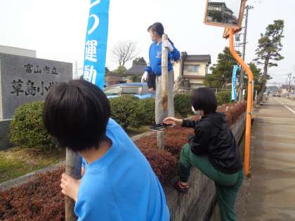 卒業まで残り6日です。今日は4年生と50m走対決をしました。6年生としては負けられません。その強い思いで走り、自己ベストを出している子もいました。また、6限には、雪囲いや雪かき用のスコップ等を片付け、学校のために働きました。