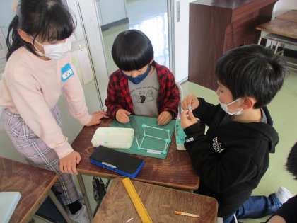 「へん」や「ちょう点」に注目できるように、粘土とストローを使った「はこ作り」にグループで挑戦しました。仲間と分担して、必要な長さに切ったり、粘土を丸めたりしながら、協力して完成させることができました。