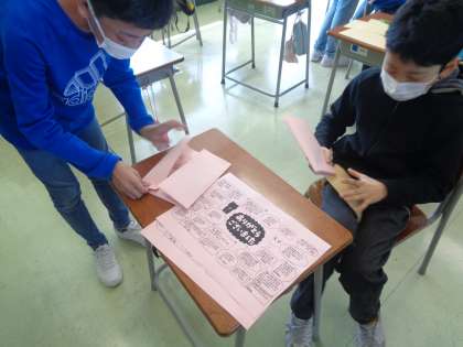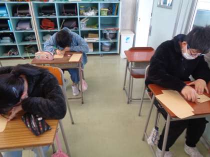 卒業まで残り3日です。お世話になった地域の方々へのメッセージをお渡しする準備をしています。3年生のときのネギ作りのことや、草島っ子会に行っていたときのことを思い出しながら作成しているようでした。