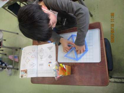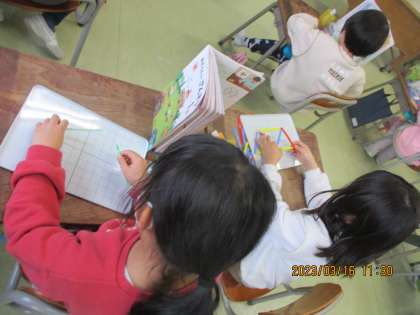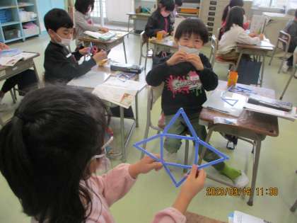 1年生 算数科の学習 公開日 2023/03/16 更新日 2023/03/16 1年生 今日は、棒を使っていろいろな形をつくりました。指定された本数で形を構成するのは、意外と難しいものです。また、つくられている形は何本の棒で構成されているのかを数えるのも、1年生にとって易しい問題ではありません。ペアの友達と確認しながら、学習を進めました。