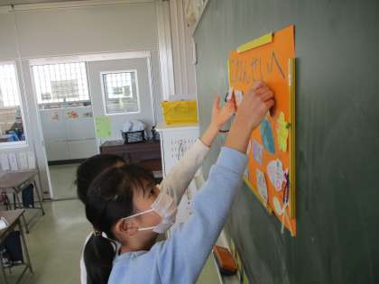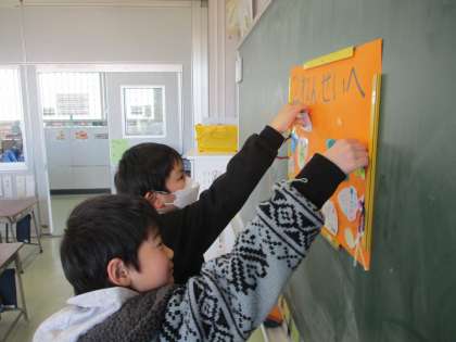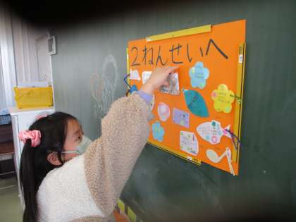 昨日、2年生が下校後に、6年生がこっそりプレゼントを黒板に掲示してくれました。
