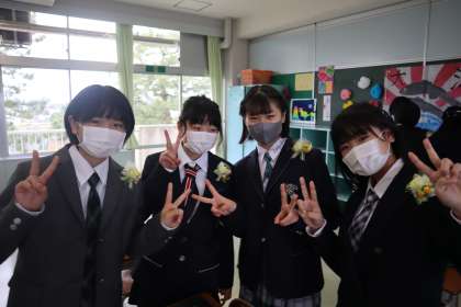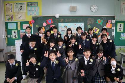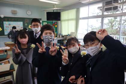 卒業式後の様子です。卒業式が始まる前は少し緊張した様子も見られましたが、晴れやかな顔で友達と話したり、卒業アルバムへのメッセージを書いたりしていました。23人全員が元気に登校し、集合写真を撮ることができたことが何よりです。
