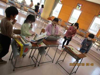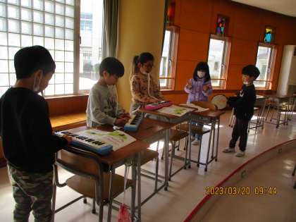 1年生 音楽科の学習 公開日 2023/03/20 更新日 2023/03/20 1年生 「子犬のマーチ」の合奏をしました。5人グループで相談して担当する楽器を決め、練習した後、お互いの演奏を聴き合いました。友達の奏でる音をよく聴いて速さを合わせると、楽しくなってきました。